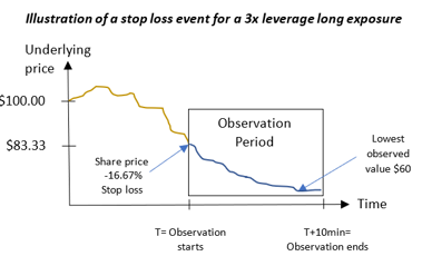 In the example above, over the day, the underlying asset fell by 30%. A 3 times long exposure without a stop loss mechanism would have suffered a 90% loss. However, because of the stop loss, the index is only down by 75% because of the reduced exposure to the underlying after the stop loss event.