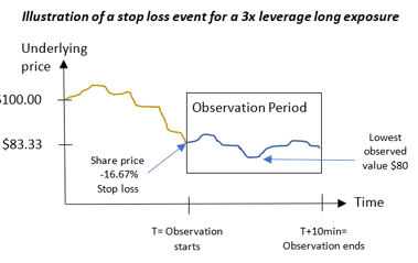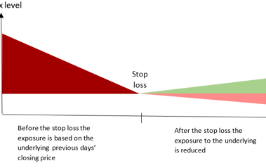 As shown in both examples above, the stop loss results in lowering the exposure to the underlying asset. In Example 1 where the underlying asset continued to drop, the activation of the stop loss resulted in reducing the total loss relative to a leveraged exposure with no stop loss mechanism. In Example 2 where the underlying recovered to its original value, the activation of the stop loss, because of the reduced exposure, resulted in an overall loss on the day, which would not have been the case for a leveraged exposure without a stop loss mechanism.
