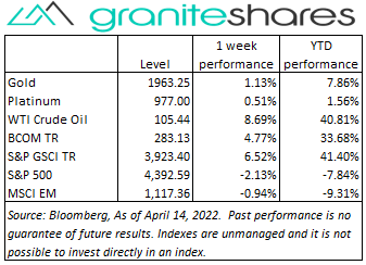 Gold prices moved higher again last week despite rising rates and a stronger U.S. dollar.  Increased safe-haven investment demand due to renewed uncertainty regarding the Ukraine-Russia war and growing concerns about continued, elevated levels of inflation helped move gold prices higher on the week. Thursday’s ECB decision to leave monetary policy unchanged pushed the U.S. dollar higher, weakening gold prices Friday.   And while 10-year U.S. Treasury rates increased 13bps last week, 10-year breakeven inflation rates continue to rise as well.  Silver and Platinum prices rose with gold prices while palladium prices were almost 3% lower, perhaps on profit taking.
