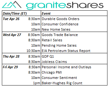 • Busier data-week with new and pending home sales, consumer confidence and sentiment, retail sales and the first estimate of Q1 GDP (Thursday).