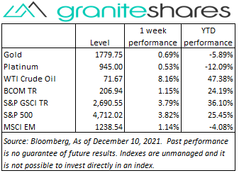Oil also moved higher last week mainly benefiting from a relief rally tied to lessened concerns regarding the seriousness of the Omicron Covid variant, reduced Fed tightening concerns and, to a lesser extent, setbacks in Iran nuclear agreement negotiations.  Oil price increases were capped by China demand concerns – precipitated by ratings downgrades of Evergrande and Kaisa groups – and a smaller-than-expected fall in U.S. oil inventories.  Natural gas prices moved sharply lower Monday, falling over 11% on continued warm weather forecasts, though prices moved higher the remainder of the week as weather models flipped, forecasting colder weather for last two weeks of December.