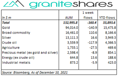 • Small commodity ETP outflows (-$160m) last week. Gold (-$141m) and crude oil (-$118) outflows were partially offset by broad commodity ($111m) inflows.