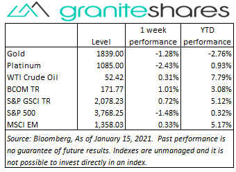 Gold prices moved similarly to oil prices, moving higher through Thursday and then selling off on Friday to end the week lower.  A weaker-than-expected PPI release on Friday, continued concerns of rising real rates and a strong U.S. dollar may have pressured gold prices lower.   President-elect Biden’s announcement of a $1.9 trillion stimulus package was seemingly shrugged off by market participants.