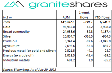 Gold prices continued their move higher last week bolstered, mainly, by Wednesday’s as-expected 75bp rate hike and seemingly less-aggressive guidance regarding future rate policy in the face of growing economic growth concerns. Thursday’s GDP release showing the U.S. economy contracted for a second month in a row added to sentiment the Fed, while still tightening, would do so at a slower pace and  begin to reduce rates sooner than expected.   10-year real yields, as a result, moved over 30bps lower ending the week at 0.10% and the U.S. dollar weakened 0.7%.
