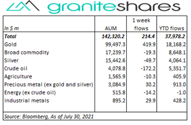 • Another week of net inflows ($214m) with gold ETPs ($420m) primarily responsible for the inflows and with crude oil ETPs (-$172m) mainly responsible for outflows.