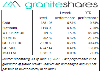 Gold prices finished the week lower, hurt by a stronger U.S. dollar and risk-on investor sentiment. Thursday’s greater-than-expected CPI release initially did little to affect gold prices.  Friday, however, saw gold prices drop close to 1% as market participants adopted the “transitory inflation” view with increasing expectations the Fed will maintain its current aggressively accommodative monetary policy, diminishing safe haven demand for gold.
