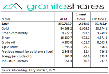 • Another week of $2 billion outflows from commodity ETPs predominantly from gold ETPs but also from silver and crude oil ETPs.   Broad commodity ETPs once again saw decent inflows of about $300 million.