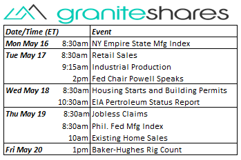 • Retail Sales, Industrial Production and Fed Chair Powell Speaks on Tuesday.