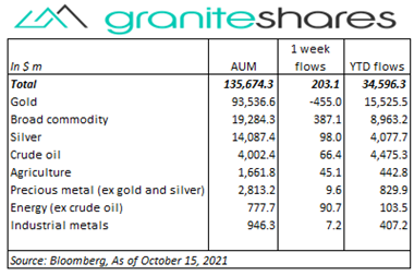 • Almost $250 million net inflows into commodity ETPs last week mainly from inflows into broad commodity ETPs but with decent inflows into almost all commodity ETPs and with only gold ETPs experiencing net outflows. Inflows included: Broad commodity ($387m), silver ($98m), energy (ex-crude oil) ($91m), crude oil ($66m) and agriculture ($58m).  Gold ETPs experienced $455 million outflows.