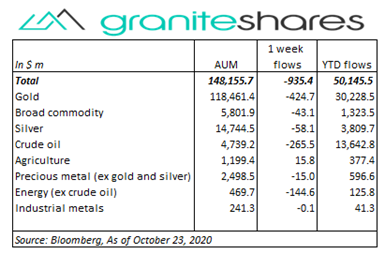 • Commodity ETPs saw just under $1 billion of outflows last week primarily from gold, silver and energy (ex-crude oil) ETPs.