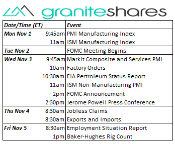 • Markit Composite and Services PMI, Factory Orders, ISM Non-Mfg PMI, FOMC Announcement and Jerome Powell Press Conference on Wednesday.