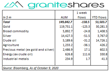 • Small outflows from commodity ETPs last week (-$138.5m). Energy (ex-crude oil) (+$111.6m) ETP inflows were offset by gold (-$125.3m), silver (-$51.5m), agricultural (-$36.1m) and crude oil (-$31.2m) ETP outflows.
