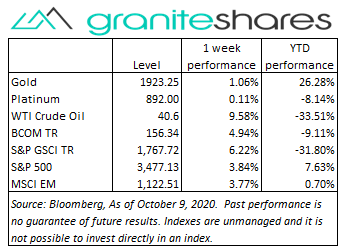 Increased optimism over passage of a stimulus package and news President Trump would return to the White House later Monday pushed U.S stock markets higher on Monday with the S&P 500 Index increasing almost 2%.   Those gains were mostly erased on Tuesday after President Trump tweeted there would be no stimulus negotiations till after the election.  Positive economic reports combined with President Trump’s reversal on stimulus negotiations pushed U.S. stock markets higher the rest of the week with the S&P 500 Index recording its best week since July.  At week’s end the S&P 500 Index rose 3.8% to 3,477.13, the Nasdaq Composite Index climbed 4.6% to 11,579.94, the 10-year U.S. Treasury rate increased 7bps to 77bps and the U.S. dollar (as measured by the ICE U.S. Dollar index - DXY) weakened another 0.8%.