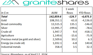 • Net outflows last week predominantly from silver ETPs but also from gold ETPs, offset by broad commodity ETP inflows.