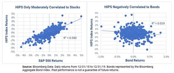 Many alternative yield categories, and HIPS in particular, straddle the divide between conventional equity and fixed income strategies, representing a hybrid stock-bond exposure. As illustrated in the diagrams above, the HIPS index is moderately correlated to the S&P 500, explaining 56% of daily movement, and is negatively correlated to Aggregate Bonds at -0.19. These data indicate alterative income may serve as a valuable diversifier of risk in both asset categories, helping to moderate portfolio volatility.