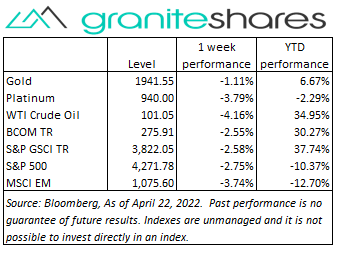 Pressured by hawkish comments from Fed governors on Tuesday and Wednesday and then again on Thursday by Fed Chairman Powell, spot gold prices ended the week over 2% lower.   10-year real yields rose 9bps to 0% Tuesday following FOMC member Bullard’s call for a Fed funds rate of 3.5% by year end and pushed gold prices nearly 1.5% lower.  Chairman Powell’s comments Thursday saying inflation needed to be addressed now and that a 50bp rate hike was a possibility in May helped pressure prices even lower.   The decline in gold prices occurred despite the fact the 10-year real yields ended the week unchanged (at -0.08%) and 10-year inflation expectations increased 8bps to 2.99%.   Silver and Platinum prices fell with gold prices.