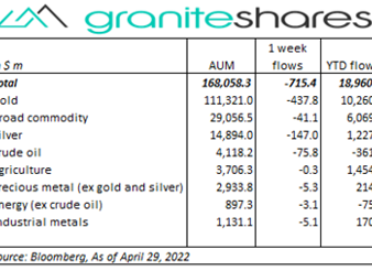 • A week of outflows from commodity ETPs  Gold ETPs saw outflows of $438 million, silver ETPs $147 million and crude oil ETPs $76 million.