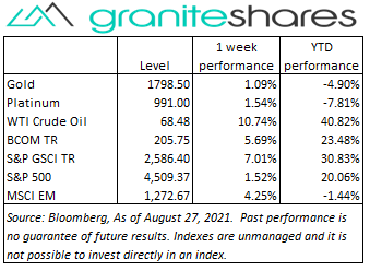 • The Bloomberg Commodity Index powered higher last week, increasing 7.1%. All sectors had positive returns with the energy sector contributing over half this week’s increase.