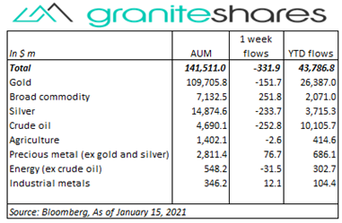 • Commodity ETPs saw $330 million outflows last week led by outflows from crude oil, silver and gold ETPs. Inflows into broad commodity and precious metal (ex-gold and silver) ETPs partially offset outflows.