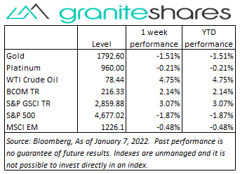 A volatile week for gold prices, falling sharply Monday and Thursday while moving ½ percent higher or more Tuesday, Wednesday and Friday.   Short-lived risk-on sentiment, spurred by easing Omicron concerns, moved prices lower Monday with rising Omicron concerns and increased inflation concerns driving gold prices higher Tuesday, recouping almost half of Monday’s losses.   Wednesday’s release of FOMC minutes, revealing Fed intentions to more aggressively tighten, pushed prices sharply lower Thursday with inflation expectations – as measured by the 10-year breakeven inflation rate – finally decreasing on the week and as 10-year U.S real yields moved significantly higher.   Gold prices moved higher Friday following a weaker-than-expected non-farm payroll report.   For the week, U.S 10-year real rates increased 34bps to -0.77% and the 10-year breakeven inflation rate decreased 8bps to 2.54%.