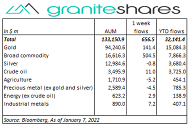 • Over $650 million of inflows into commodity ETPS mainly from broad commodity ETPs ($505m) and gold ($141m).  Only small flows in the remaining sectors.