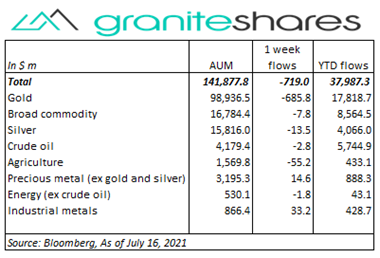 • Over $700 million of outflows from commodity ETPs last week almost all from gold ETP outflows.  Agriculture ETPs saw $55m outflows while base metal ETPs experienced $33m inflows.