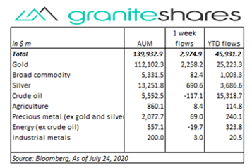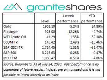 Up over 5% on the week, gold prices closed at of $1902.1 per ounce on Friday, their all-time-closing-level high.  Silver prices, though closing off their Thursday’s high, surged over 15%, reaching their highest levels since 2014.  Platinum prices, surging over 12%, climbed to their highest levels since late February this year.  Precious metal prices already supported by unprecedented monetary and fiscal stimulus, benefited from increased tensions between the U.S and China, increased concerns about U.S. economic growth in light of growing Covid-19 cases and a significantly weaker U.S. dollar (as measured by the U.S. Dollar Index – DXY).