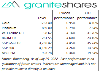 Gold prices continued their move higher last week bolstered, mainly, by Wednesday’s as-expected 75bp rate hike and seemingly less-aggressive guidance regarding future rate policy in the face of growing economic growth concerns. Thursday’s GDP release showing the U.S. economy contracted for a second month in a row added to sentiment the Fed, while still tightening, would do so at a slower pace and  begin to reduce rates sooner than expected.   10-year real yields, as a result, moved over 30bps lower ending the week at 0.10% and the U.S. dollar weakened 0.7%.