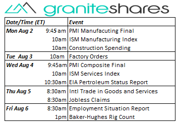 • PMI and ISM manufacturing and services indexes occupying the first half of the week and jobless claims and the non-farm payroll report filling the latter half.