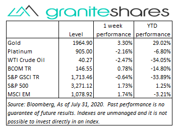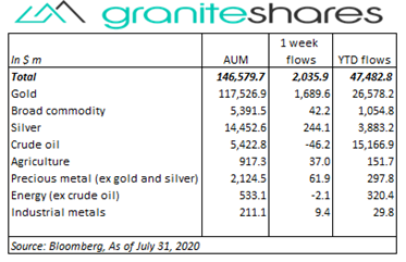 After closing at a record high the previous Friday, gold prices never looked back, reaching new closing-level highs every day last week and closing at an all-time high of just under $1,965 per ounce.   Increased geopolitical tensions, particularly between the U.S and China, President Trump’s tweet suggesting a need to delay elections, increased economic growth concerns stoked by a record quarterly contraction in U.S. GDP and a disappointing jobless claims number, Chairman Powell’s comments after last week’s FOMC meeting that the road to recovery will be long and dependent on the virus, congressional stimulus package negotiations and a weakening U.S. dollar all helped support and move gold prices higher.