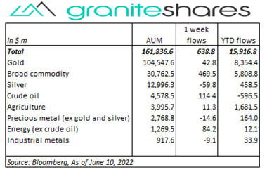 • Small inflows ($639m) into commodity ETPs last week predominantly into broad commodity ($479m) and crude oil ($114m) ETPs.