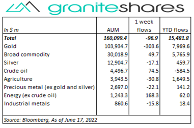 • Minimal commodity ETP outflows last week. Gold (-$304m) outflows were almost entirely offset by energy (ex-crude oil) ($168m), crude oil ($75m) and broad commodity ($50m) inflows.