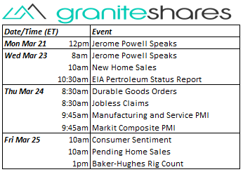 • Decent data-week with Fed Chair Powell speaking Monday and Wednesday, housing data Wednesday and Friday and Durable Goods Orders Thursday.