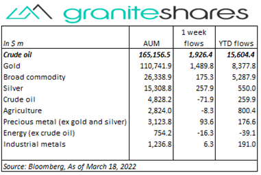 • Decent flows into commodity ETPs last week with gold ($1,490m) ETP inflows leading the way.  Silver and broad commodity ETPs saw inflows of $258 million and $175 million, respectively. Crude oil ETPs experienced $72 million of outflows.