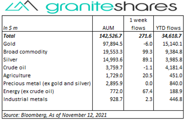 • $270 million commodity ETP outflows last week. Broad commodity ($99m), silver ($89m) and energy (ex-crude oil) ($67m) ETP inflows were the primary inflows last week. Only small, minimal ETP outflows last week.