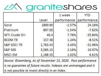 Gold prices moved sharply lower Monday falling 5% following news of Pfizer’s positive vaccine results but then moved higher throughout the remainder of the week with increased concerns surrounding Covid-19 cases, a weakening U.S. dollar and increasing expectations of U.S. and global fiscal and monetary stimulus.    Silver and platinum prices mainly followed gold prices.