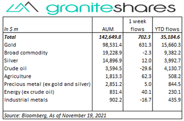 • Decent inflows into commodity ETPs ($702m) driven primarily by inflows into gold ETPs ($631m) and to a lesser extent by agriculture ($62m) and energy (ex-crude oil) ($40m) ETP inflows. Only small ETP outflows last week.