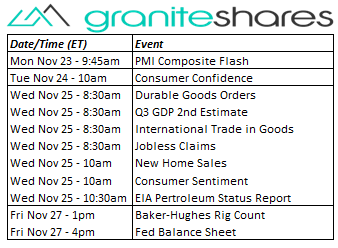 • Relatively busy holiday-shortened data-week, with most data released on Wednesday. Notable releases include second-estimate Q3 GDP, Durable Goods Orders and Jobless Claims on Wednesday.