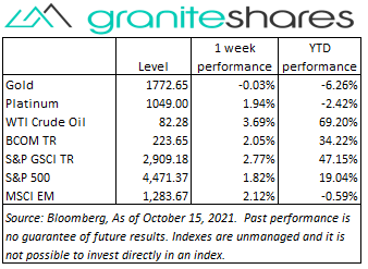 • The Bloomberg Commodity Index gained 2.1%, benefiting from rising base metal and energy prices. The grains and livestock sectors detracted from the Index’s gains.