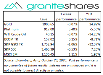 Increasing 1.2% through Wednesday on increased hopes of a U.S. coronavirus stimulus package and a weakening U.S. dollar, gold prices fell 1.2 on Thursday following much stronger-than-expected existing homes sales and lower-than-expected jobless claims.  Silver and platinum prices were higher on the week, benefiting from a weaker U.S. dollar and higher base metal prices.