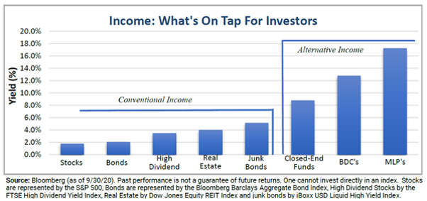 The solution to this income stream problem may lie in an ecosystem of alternative investment beyond the frontier of conventional options. The three prominent contenders in this high-yield arena are Closed-End Funds (CEFs), Business Development Companies (BDCs) and Master Limited Partnerships (MLPs). These alternative structures yielded 8.77%, 12.79% and 17.25%, respectively, as of 9/30/20.